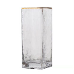 Tuo kotiisi ripaus eleganssia tällä kevyen ylellisellä lasimaljakolla, joka yhdistää modernin minimalismin ja hienostuneen käsityötaidon. Maljakko on valmistettu käsinpuhalletusta kirkkaasta lasista, jossa on ainutlaatuinen kiillotettu pinta ja pehmeästi teksturoitu ulkonäkö. Suorakulmainen muoto ja kullattu reunus lisäävät tyylikkyyttä ja tekevät siitä täydellisen sekä kukka-asetelmiin että yksinään koriste-esineeksi.