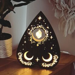 Tämä ainutlaatuinen sisustusvalaisin yhdistää modernin minimalismin ja mystisen estetiikan. Valaisin on valmistettu MDF-puusta ja koristeltu tarkalla kaiverrustekniikalla, jossa sydämenmuotoinen muoto kätkee sisäänsä hehkuvan kristallin. Kuunsirpit, tähdet ja koristeelliset kuviot luovat lumoavan valon, joka tekee tunnelmasta lämpimän ja rauhoittavan.