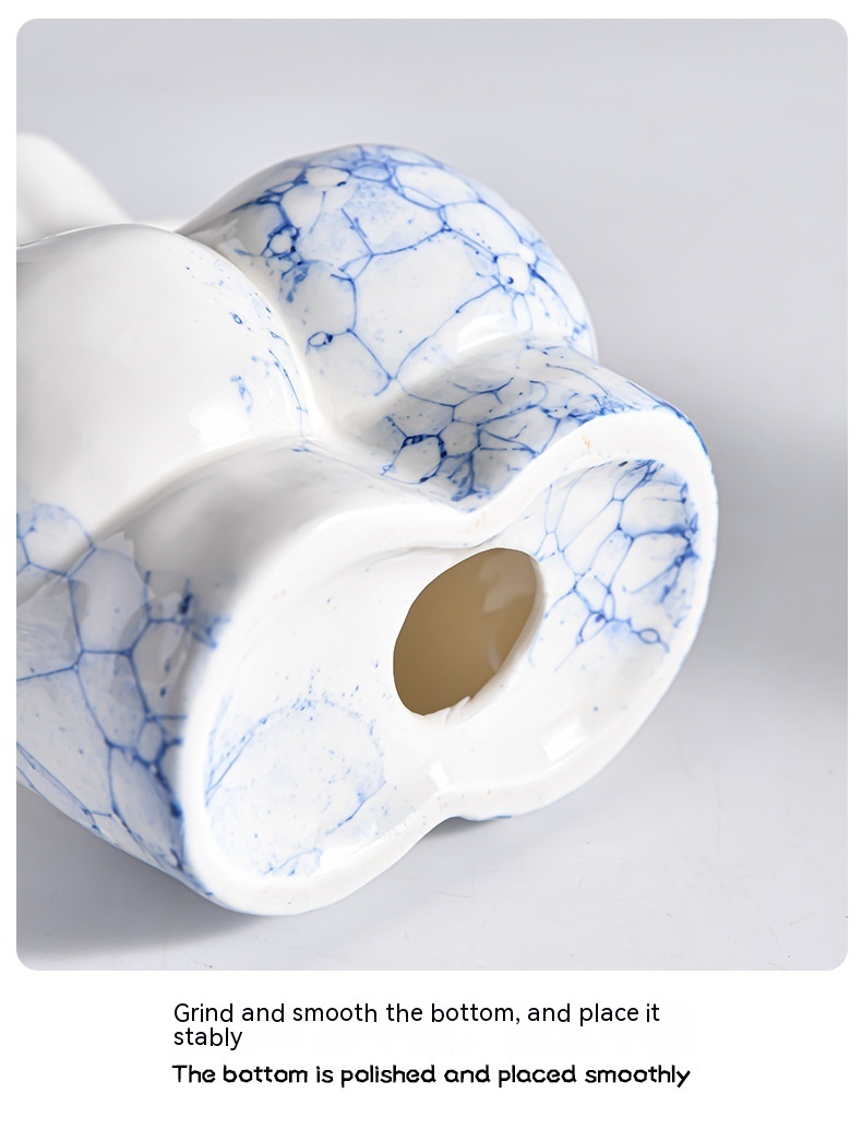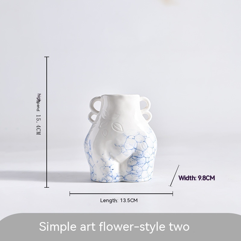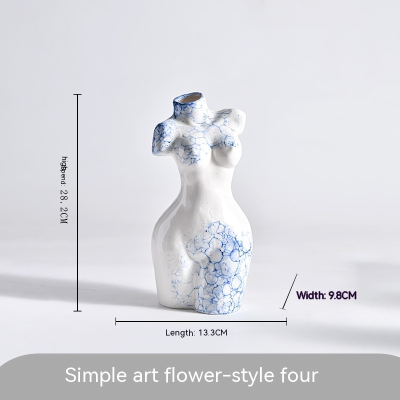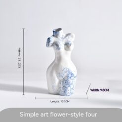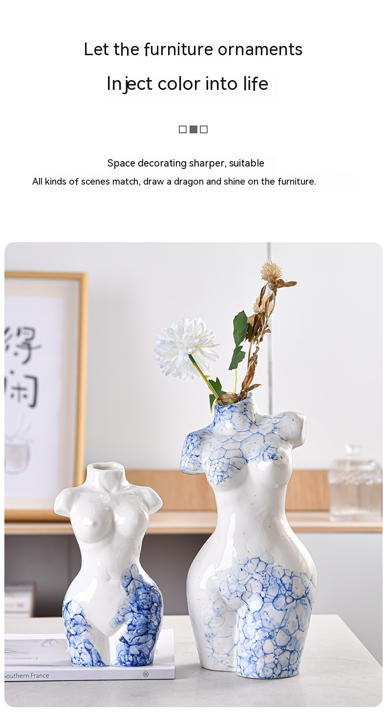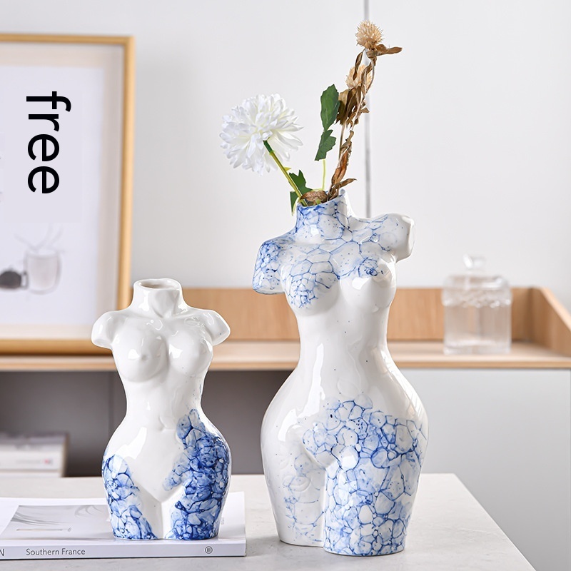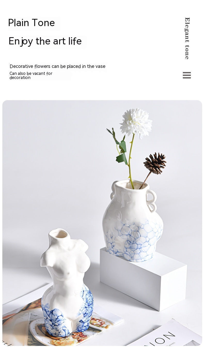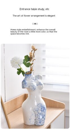 Tuo sisustukseesi modernia taidetta ja eleganssia näillä valkoisilla posliinimaljakoilla, joissa yhdistyvät ihmisvartalon veistoksellinen estetiikka ja kauniit siniset koristekuviot.