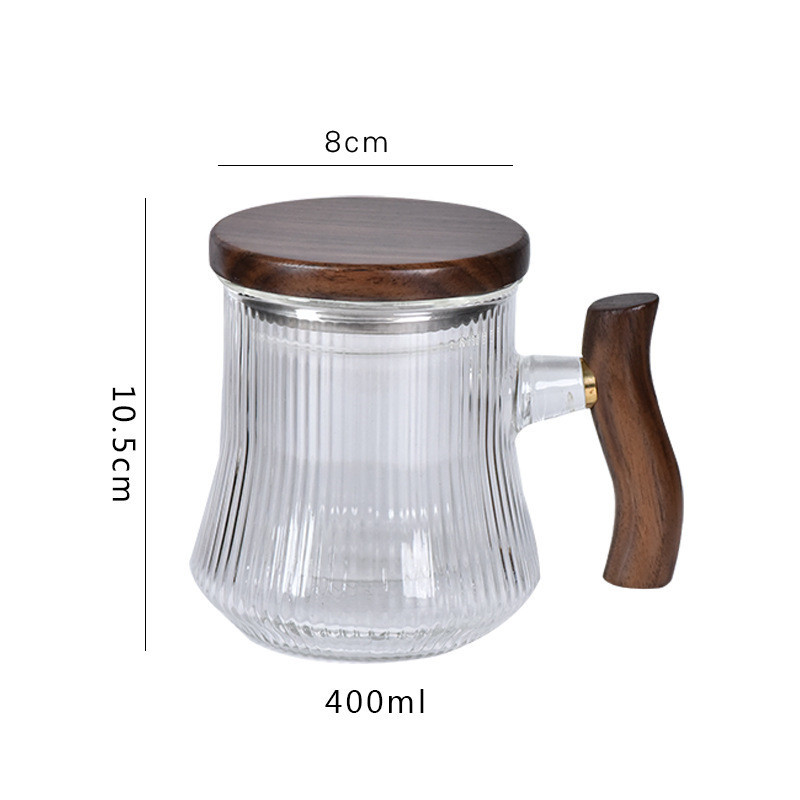 Tyylikäs teekannu-muki, jossa on lämmönkestävä lasirunko, lasinen suodatin, sekä puinen kahva ja kansi. Tämä kaunis yhdistelmä perinteistä käsityötä ja modernia toimivuutta tekee siitä täydellisen valinnan teen ystäville.
